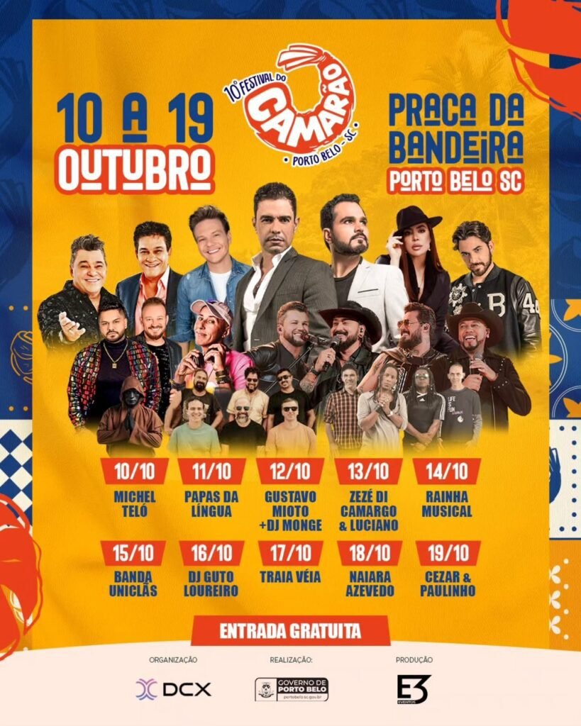 Porto Belo, no Litoral Norte de Santa Catarina, se prepara para dez dias de festa, música e tradição. De 10 a 19 de outubro, o Festival do Camarão chega à sua 10ª edição com a promessa de ser a maior já realizada. O evento celebra também os 193 anos do município, reunindo gastronomia, cultura e grandes nomes da música nacional, tudo com entrada gratuita.